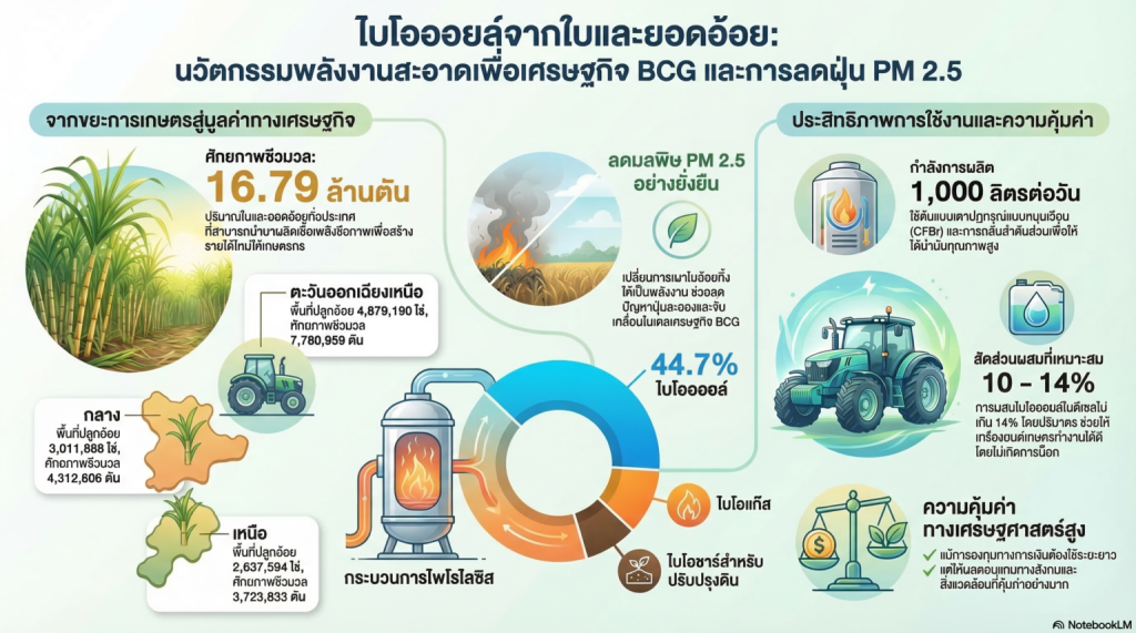 ปัจจุบันภาคการเกษตรและอุตสาหกรรมอ้อยกำลังเผชิญกับความท้าทายสำคัญ ทั้งวิกฤตฝุ่นละอองขนาดเล็ก PM 2.5 ที่มีสาเหตุส่วนหนึ่งจากการเผาใบอ้อย รวมถึงภาระต้นทุนราคาน้ำมันเชื้อเพลิงฟอสซิลที่ปรับตัวสูงขึ้นอย่างต่อเนื่อง มหาวิทยาลัยขอนแก่น เล็งเห็นถึงปัญหาดังกล่าว จึงได้วิจัยและพัฒนานวัตกรรมการผลิต “ไบโอออยล์” (Bio-oil) เพื่อดึงศักยภาพของใบและยอดอ้อยที่มีปริมาณเหลือทิ้งสูงถึง 16.79 ล้านตันต่อปี มาแปรรูปเป็นพลังงานสะอาด ป้องกันการสูญเสียชีวมวลไปโดยเปล่าประโยชน์ และสร้างมูลค่าเพิ่มทางเศรษฐกิจให้แก่เกษตรกร